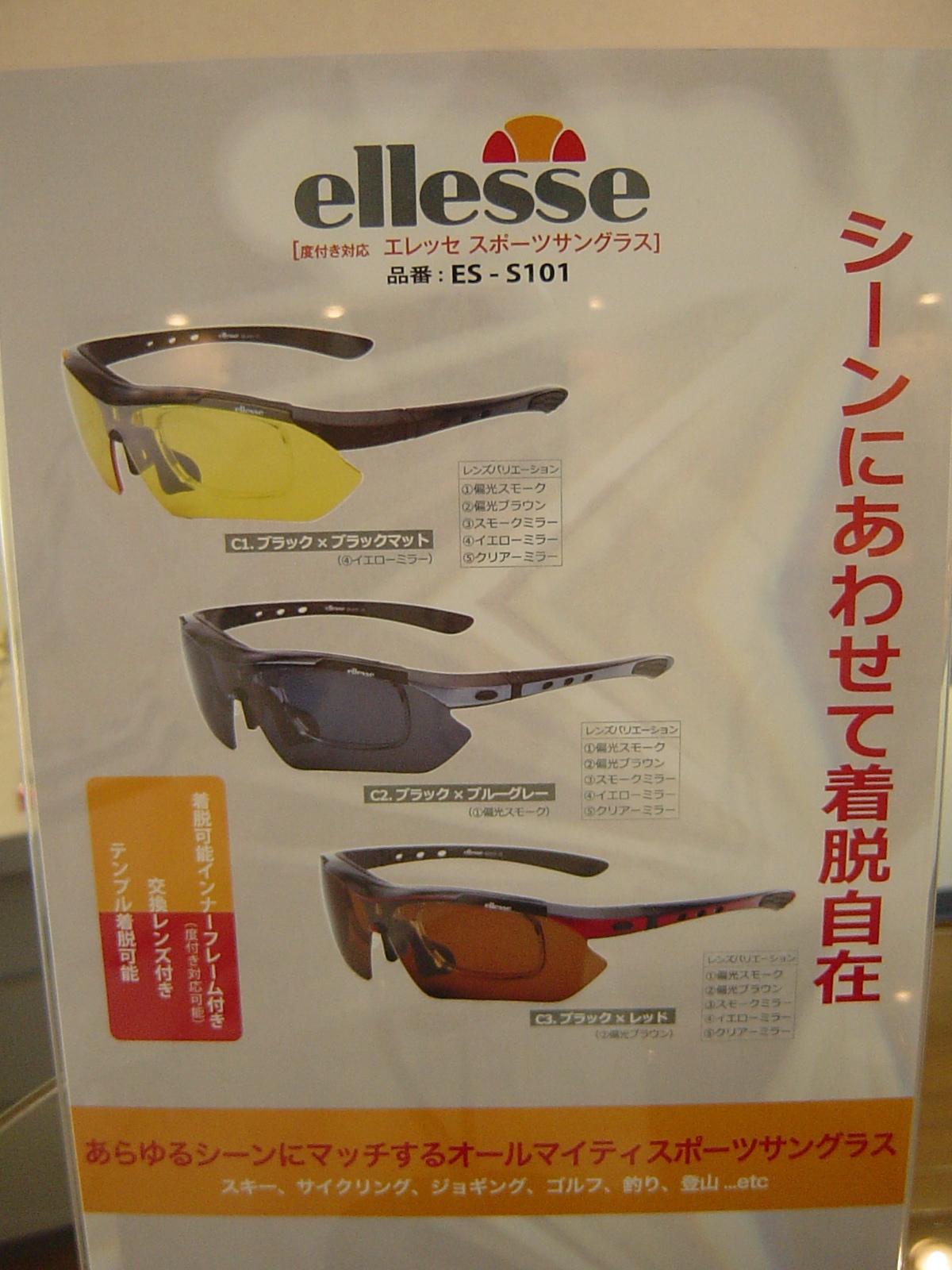エレッセスポーツサングラス ES-S101 交換レンズ•ケース付き ¥12,600 プラス3,150円で度付き対応します。